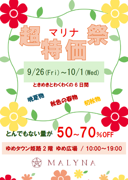 9/26~10/1 ゆめ広場にて「超特価祭」開催決定 (営業は10時から18時までです)